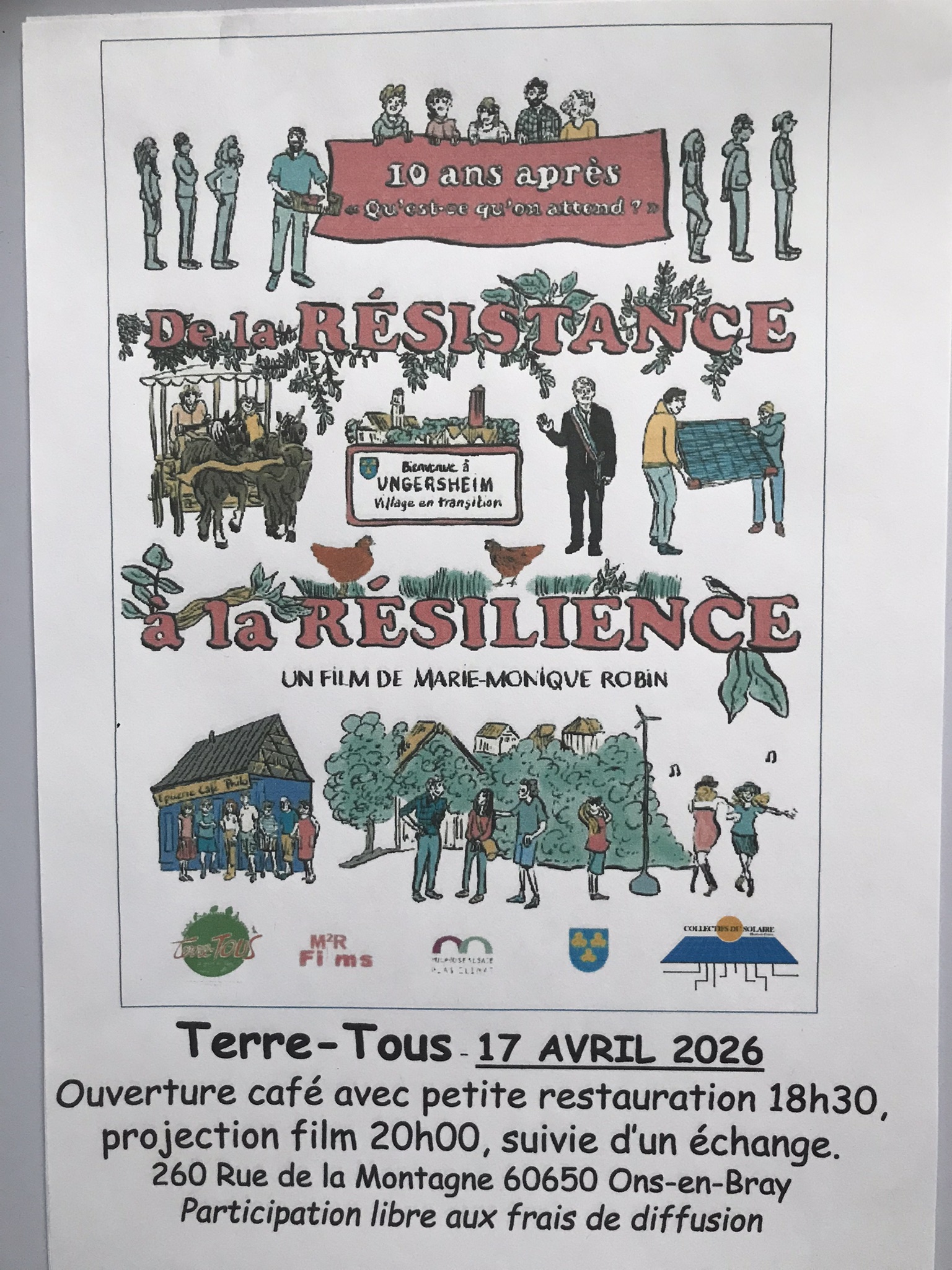 - Vendredi 17 Avril à 20h : projection suivie d'un échange autour du film "de la résistance à la résilience", de Marie-Monique Robin. Voir affiche. Participation libre aux droits de diffusion. Le bar sera ouvert dès 18h30 pour ceux qui voudraient se restaurer avant la projection.