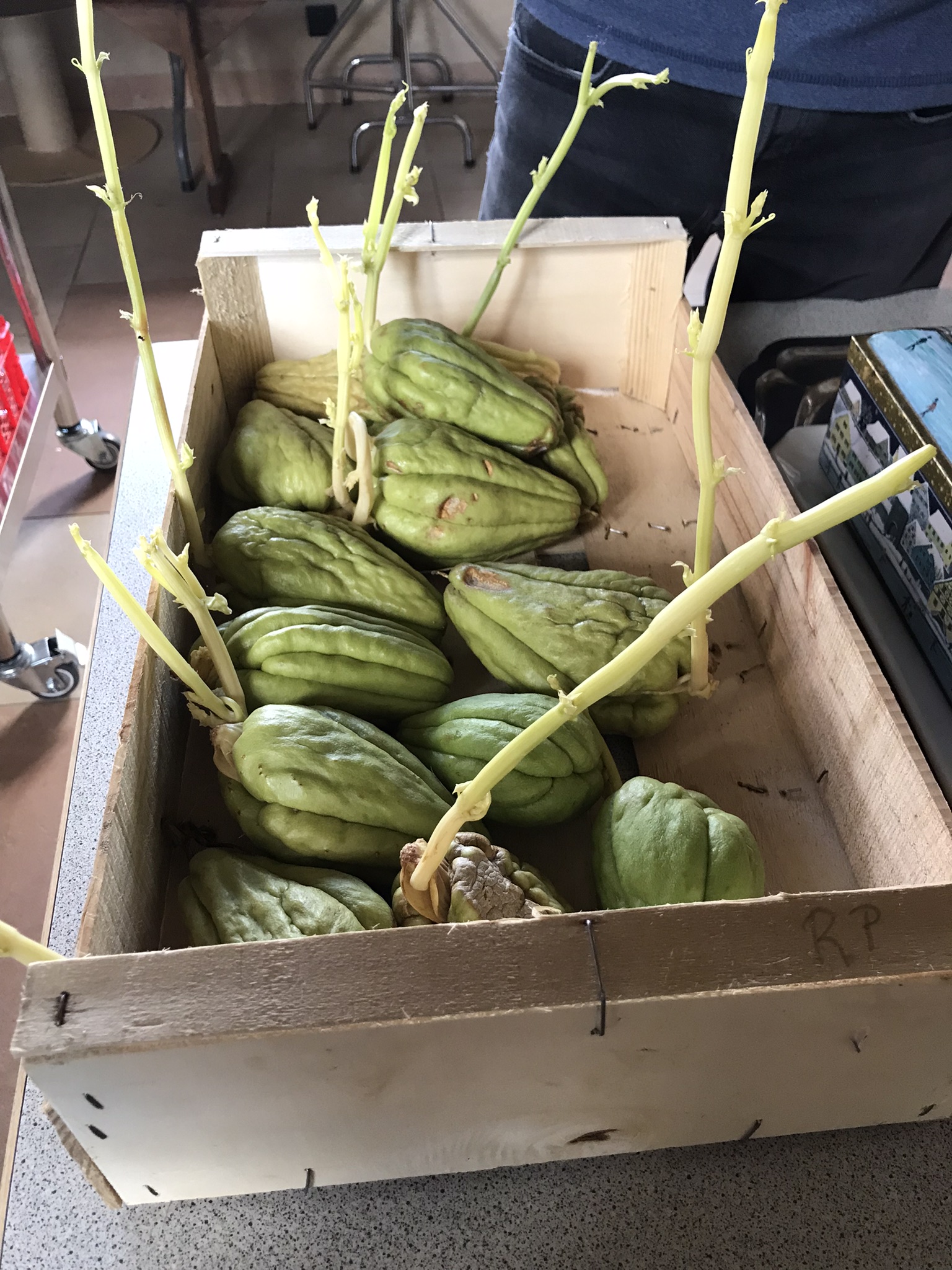 - Pierre-André nous a apporté des chayottes à planter. Il arrive a faire pousser Ce légume exotique proche de la courge est aussi appelé chouchou ou christophine ici, alors on va essayer.