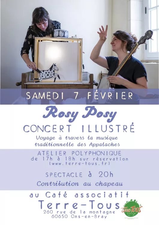Soutien scolaire avec Isabelle et Sylvie le matin. Atelier de chant polyphonique ouvert à tous (10 ans +) de 17 à 18h, suivi à 20h d'une soirée musicale avec le groupe Rosy Posy qui nous fera voyager dans les Appalaches avec sa musique et ses dessins ! ! ! Louisiane et Sophie passeront du violon au banjo, à la guitare ou à la mandoline pour nous faire découvrir les ballades traditionnelles des Appalaches. Participation au chapeau.
