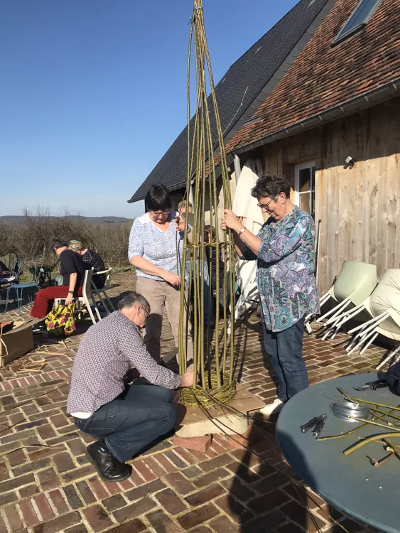 - Un arbre en vannerie a été démarré comme œuvre collective pour servir lors du premier week end de Mai consacré au chêne Notre Dame. L'atelier s'est déroulé sur la terrasse, au soleil, le bonheur !