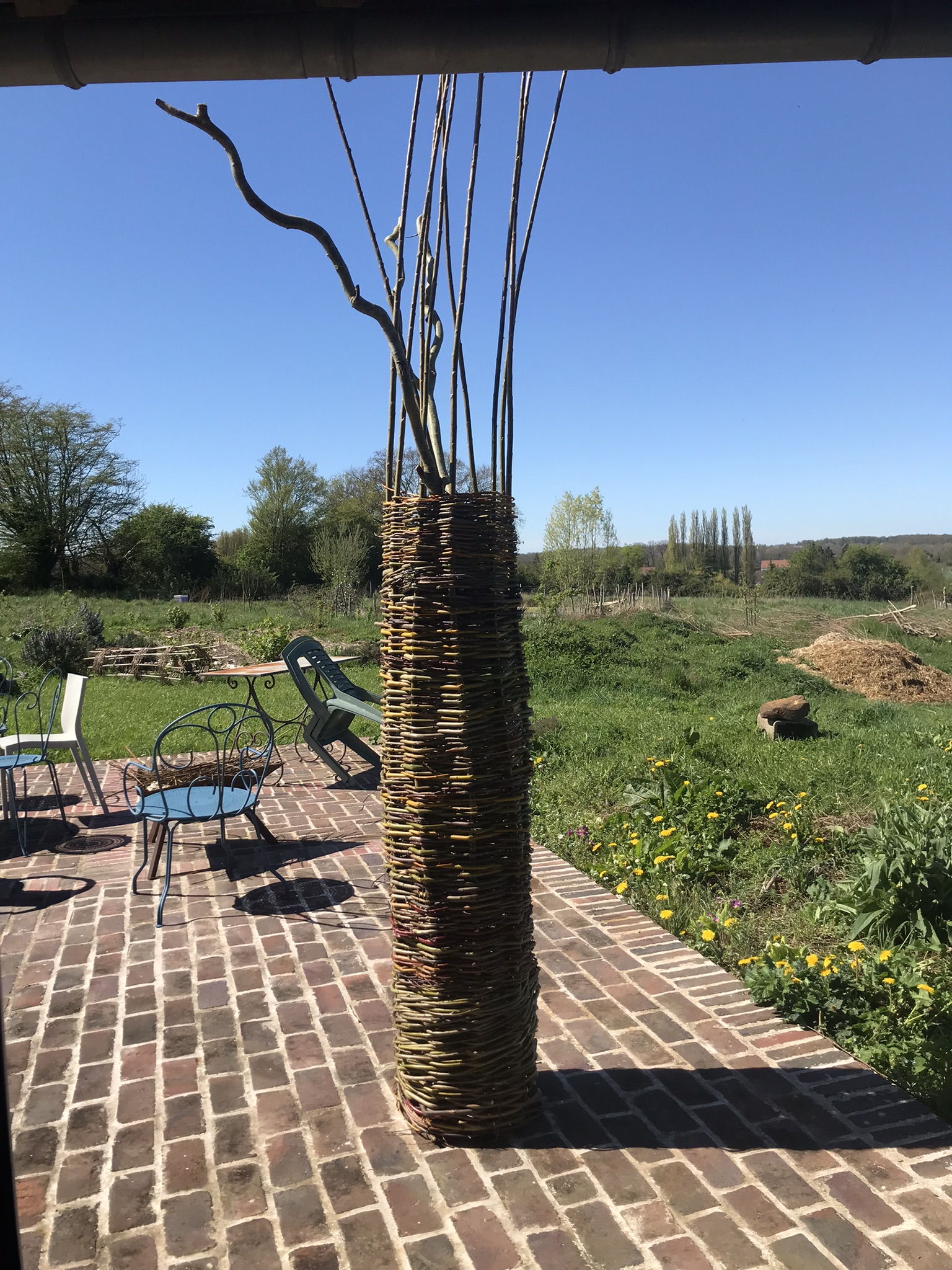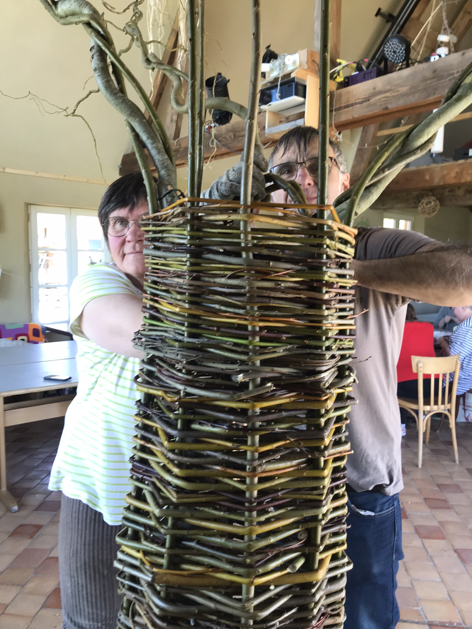 Trois animateurs de l'atelier vannerie sont venus avancer l'arbre qui servira aux activités créatives. Le résultat est splendide et trône dans la salle, en attendant d'être utilisé pour y accrocher des créations.