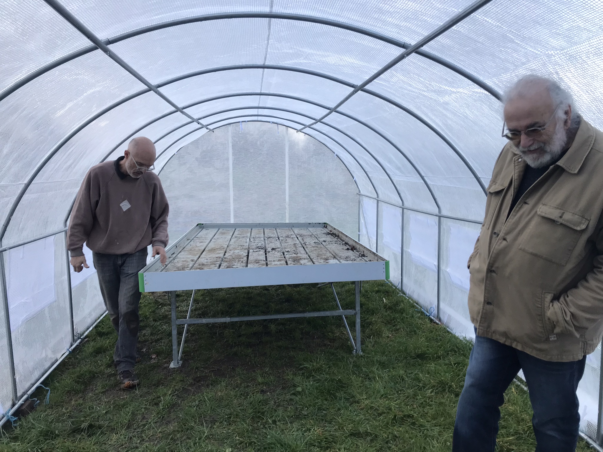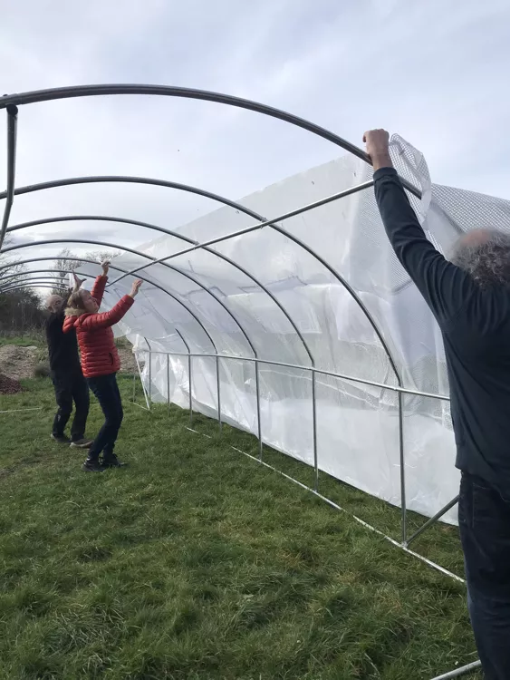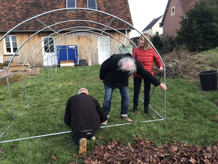Dimanche après-midi : montage de la serre avec les bénévoles qui le peuvent. Il s'agit de monter les tubes, placer la bâche et la lester au sol.