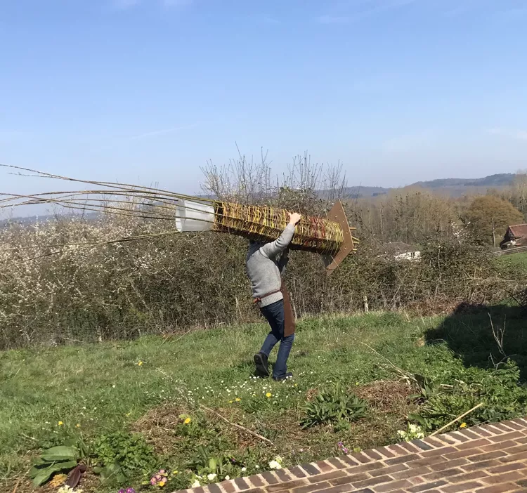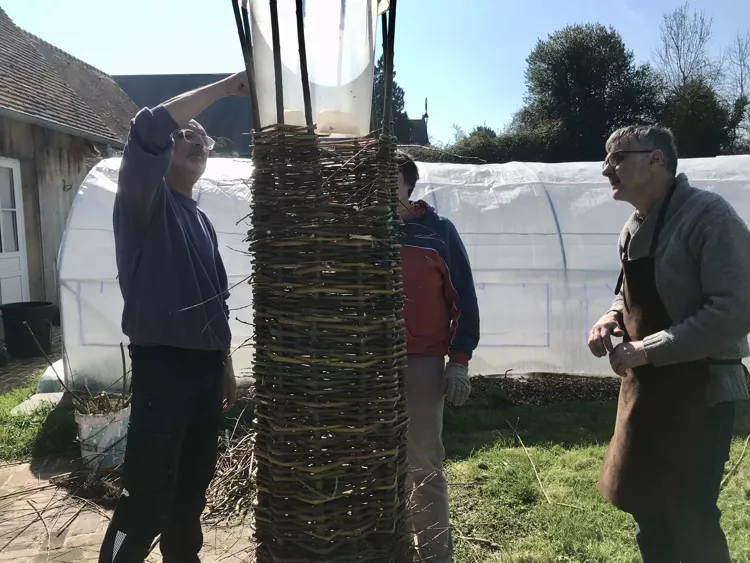 - L'atelier de vannerie prépare un magnifique arbre pour le week end du 01er Mai où nous nous "agiterons" autour du chêne Notre Dame et de son histoire. Des cornes de gazelle ont été confectionnées, le tronc de l'arbre se forme avec une alcove en prime pour mettre des trésors, des branches de saule tortueux apportés par Isabelle vont étoffer l'ensemble. A ce propos : que ceux qui ont des photos, cartes postales ou autres souvenirs de l'époque où le chêne Notre Dame rassemblait la population locale, nous les confient ; ils feront partie de la fête de ce week end de Mai. Plusieurs activités sont en cours de gestation pour ce week end de 3 jours : un RV sur le lieu où un nouveau chêne a été planté, des échanges de témoignages, une création d'empreintes avec l'artiste Cécile Marty que nous accrocherons sur l'arbre créé par l'équipe de vannerie, exposition de l'artiste, concert de Tempo Giusto.