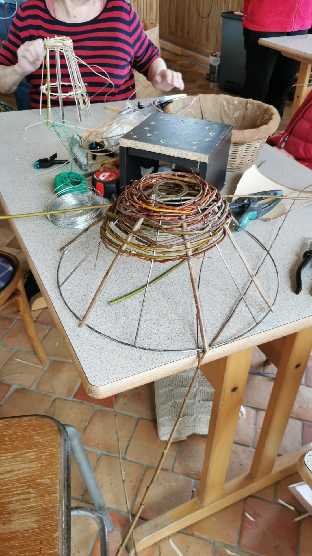Après la taille de l'osier et un repas partagé bien revigorant, 15 vanniers.ères se sont concentré.e.s sur leurs réalisations, avec le nouveau projet d'abat jour. Certains.es se sont replié.e.s sur un cache bouteille, plus rapide à réaliser.