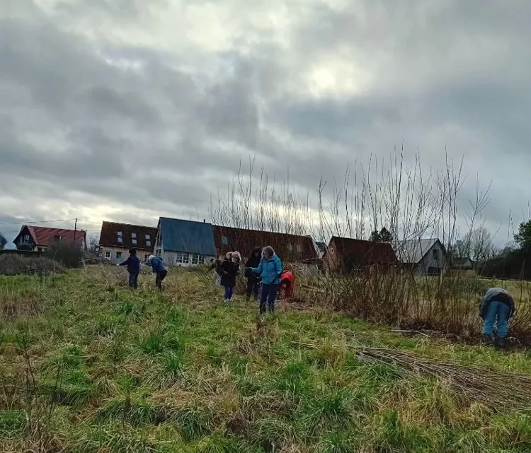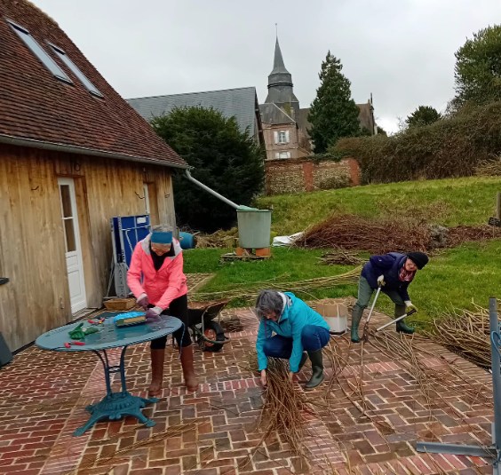 Michèle est venue donner un coup de main sur le nettoyage d'une planche. Plus qu'une à faire, il est grand temps car le printemps pointe son nez. * L'équipe vannerie a taillé tous les saules-osier autour de la mare. Belle efficacité entre ceux qui coupent, ceux qui ébranchent, ceux qui transportent et ceux qui calibrent et mettent en bottes ! Il reste encore quelques heure de triage & bottelage à prévoir sur la terrasse pour terminer l'opération.