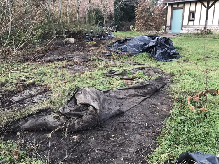 - François poursuit son entreprise de nettoyage des zones à l'entrée de TT : il n'y a plus de matériaux dispersés, et la grosse toile qui avait recouvert le sol est en passe d'être retirée pour permettre l'aménagement d'un lieu d'agrément.