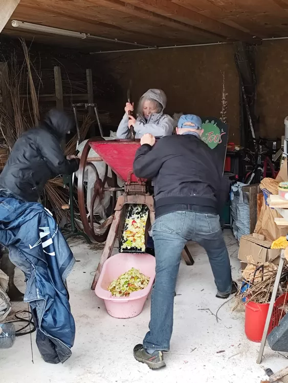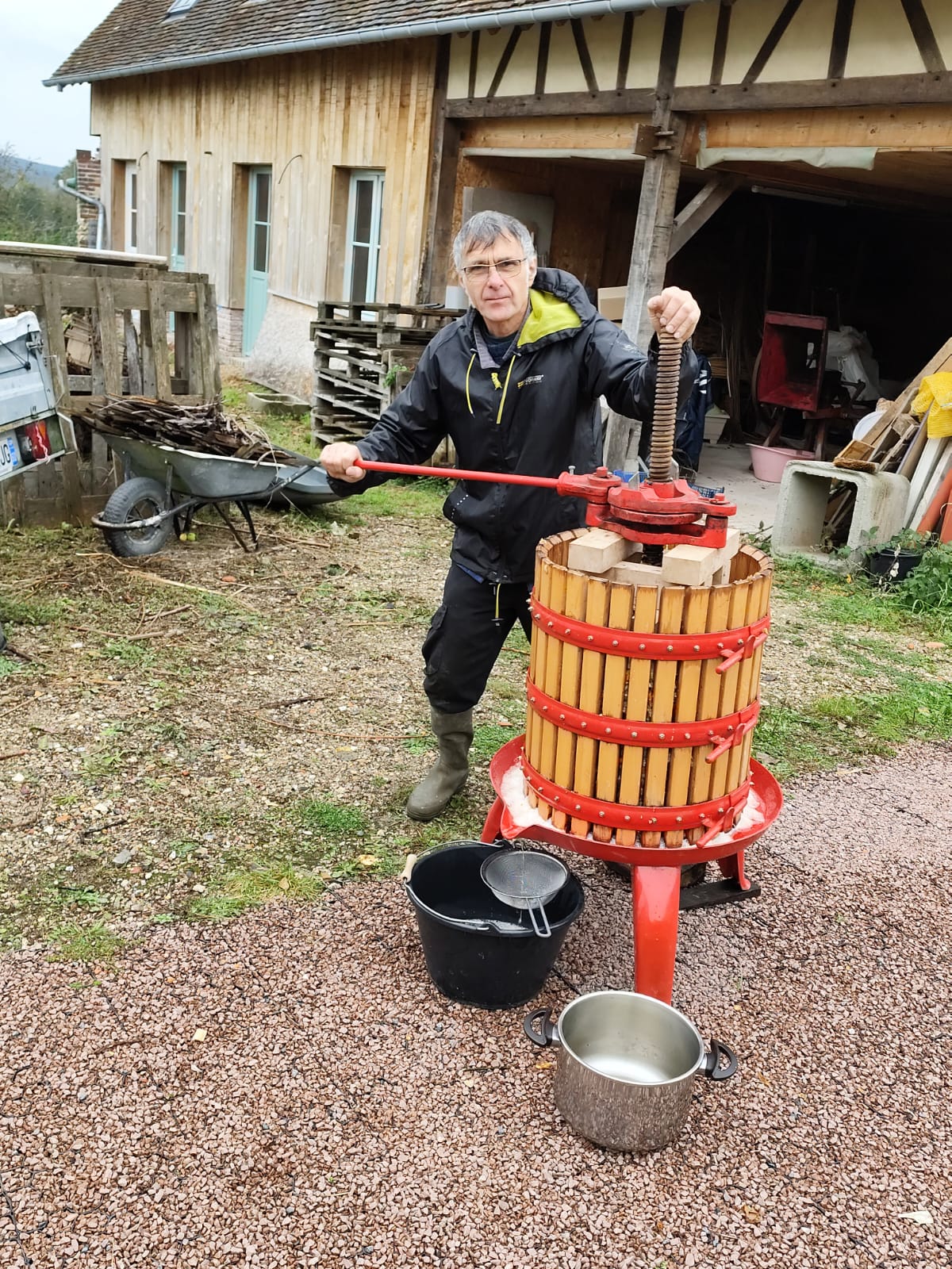 - Les pommes apportées durant les portes ouvertes ont été pressées par Sylvie, Véronique, Jacky et Philippe pour faire du jus de pommes pasteurisé en bouteilles.