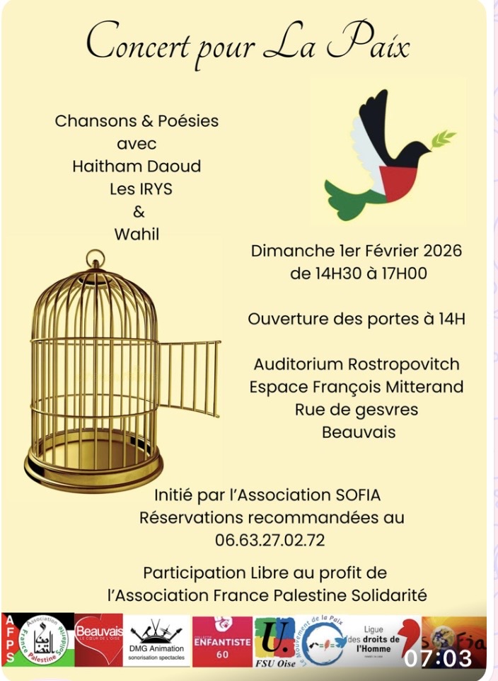 -Dimanche 01 Février à la Salle de l'auditorium Rostropovitch de 14h30 à 17h : Concert pour la Paix à l'initiative de l'association Sofia, au profit de l'association France Palestine Solidarité. Ouverture des portes à 14h. Réservation conseillée au 06 63 27 72 02 72.